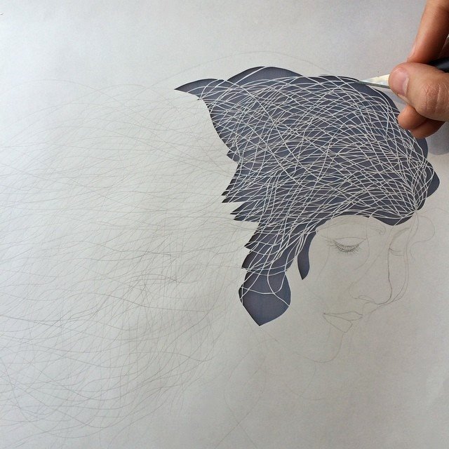 先以鉛筆打底再動刀,用過美工刀或者筆刀的人都知道,要徒手割出一個紙型,刀片的銳利度和手感都是重要關鍵,紐約藝術家 Maude White 不只是雕刻出細細的線段,連女性髮絲飄揚的律動感也掌握得很好,讓作品呈現出很棒的神韻。