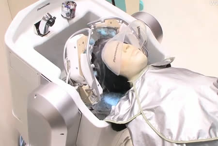 為了因應日本日益老化的人口趨勢,以及幫忙照顧久病在床的病患,Panasonic開發出自動洗髮機,在看似普通的躺椅及用來沖水的臉盆中裝上電腦系統以及16根機械手指,一旦有人躺上去,它們會先伸出機械手臂以3D掃描頭形,從資料庫中找出最適合該頭形的按摩方式、力道,然後開始洗髮的步驟,接下來,這16根機械手指就會開始按摩頭皮,而且機械手臂還會來回「巡視」,確保手指按摩的力道剛中帶柔、柔中帶剛得恰到好處,嗯......也許之後髮廊的洗頭妹可得小心別被人搶了飯碗囉!