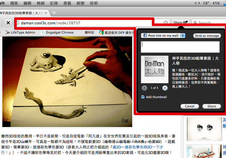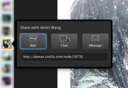 再來是分享網頁的功能,既然號稱是社交瀏覽器,看到像大人物這種有創意的網站就要能夠很快分享出去啊。網址列旁有個share按鍵,只要按一下就可以轉貼訊息到你自己的塗鴉牆上,或是寄給朋友。