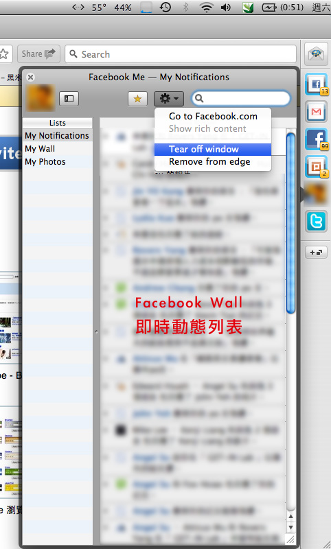 接下來就是左邊欄的重頭戲了,整排都是你的Facebook好友,採取和FB站上一樣的紅綠燈來顯示大家的狀態(圖有點糊,請意會XD),點一下每個人的頭像同樣可以看到他們最新的更新,完全不用開臉書
