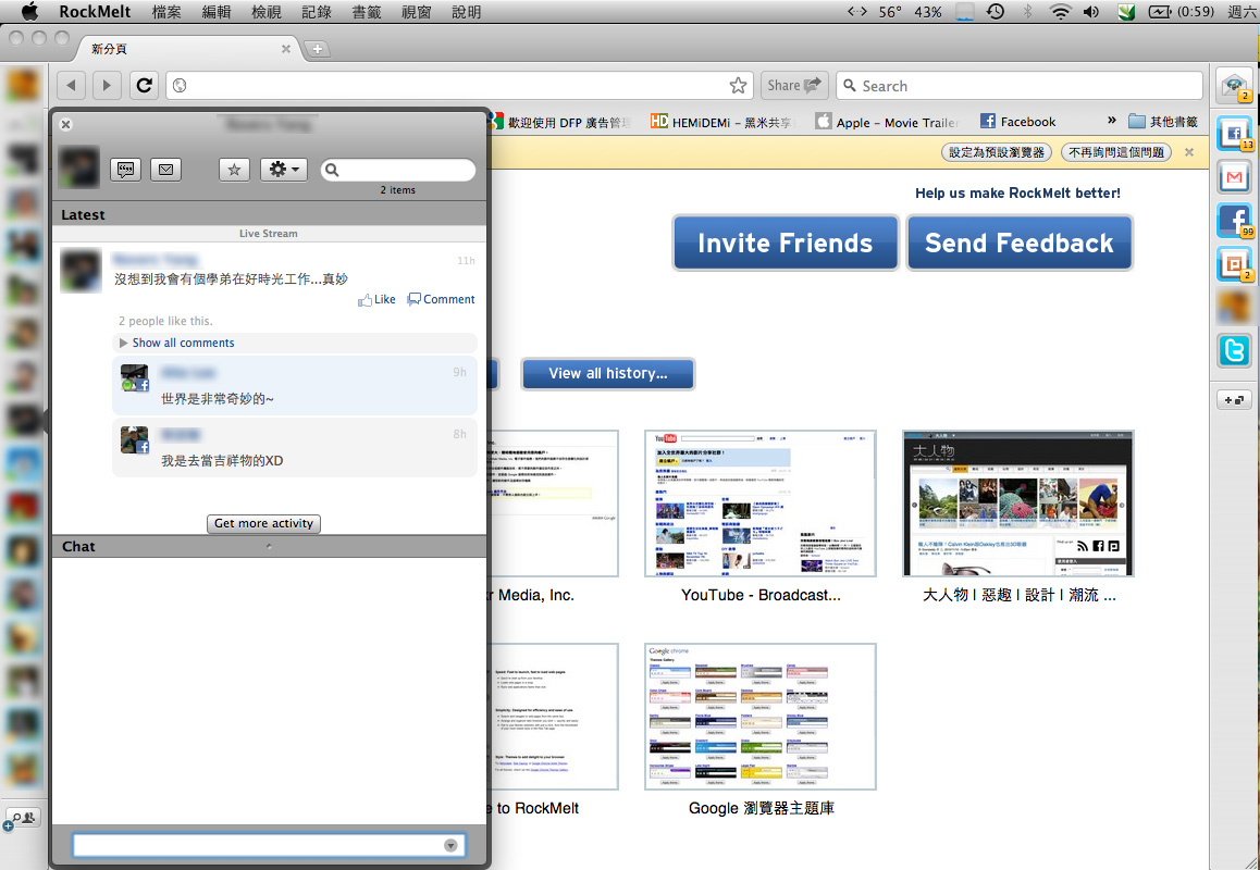 如同你在影片裡看到的一些示範操作,RockMelt除了一些操作邏輯不同,外掛元件更是讓人感到隨時有好多朋友在陪你上網,接著我們一步一步拆開來看,請服用~
