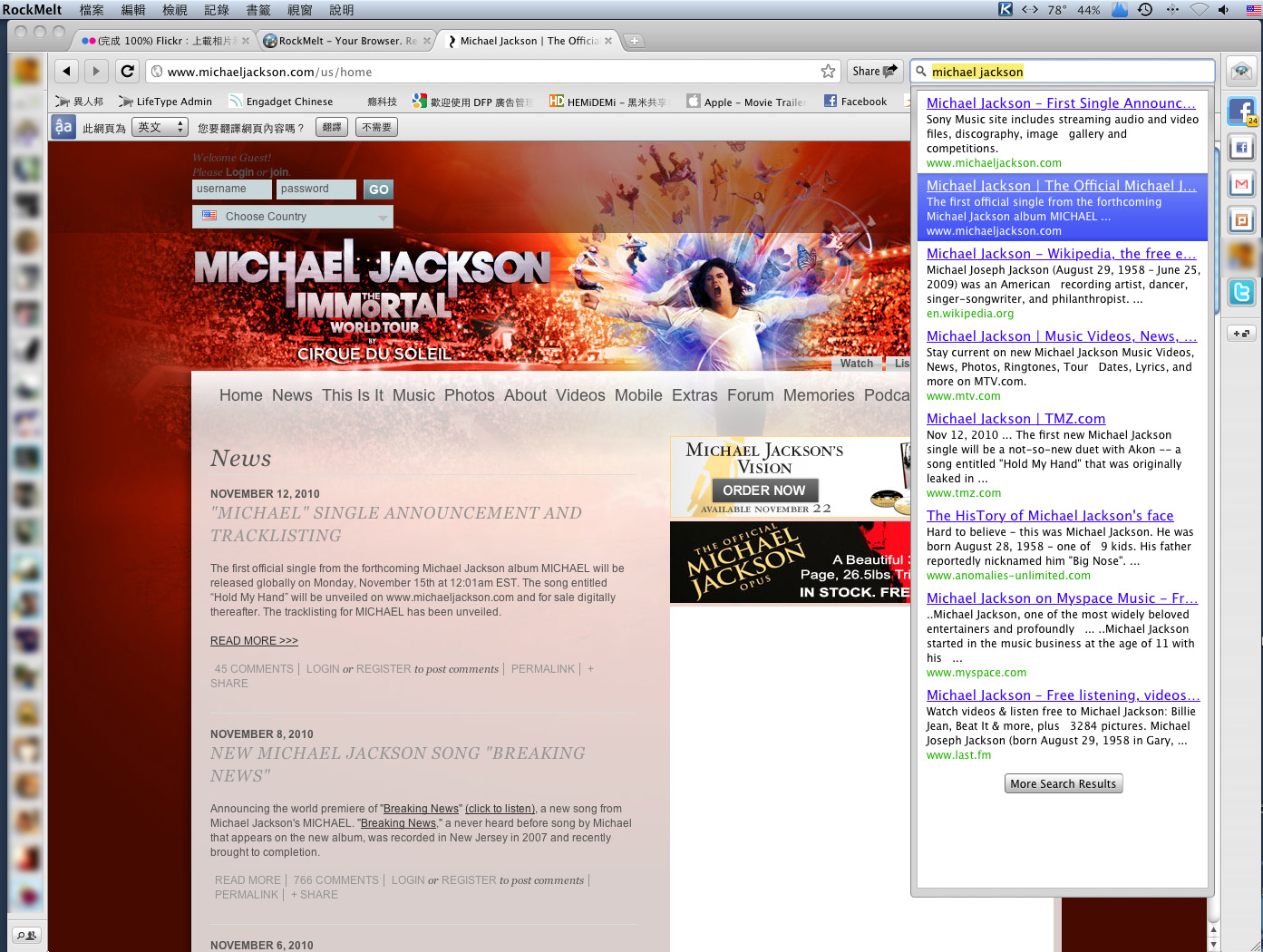 最後的最後,RockMelt的搜尋也是一絕,它看起來是使用google贊助的搜尋功能,不過在搜尋工具列裡輸入完關鍵字後,會直接嘩啦的列出一整排結果,每點擊一個,瀏覽器的頁面就馬上更新成那個網頁,是很特別的作法。
