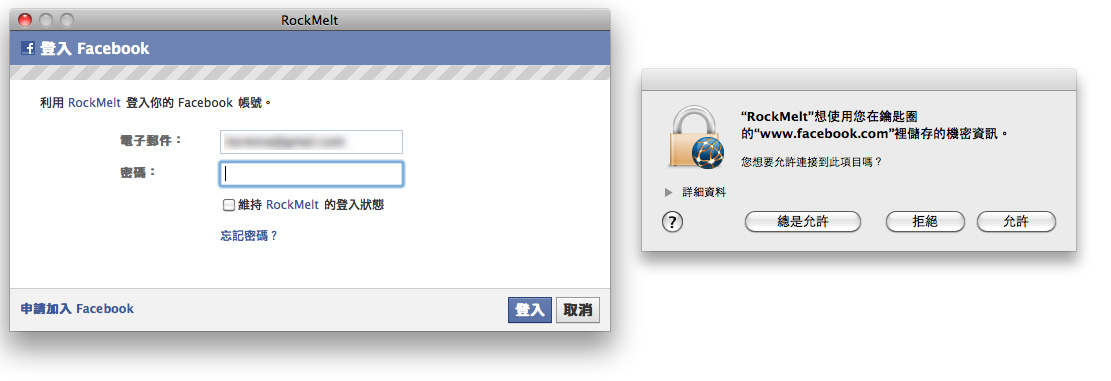 在安裝完RockMelt之後,打開程式的第一眼會看到程式要求你允許它取用Facebook的資料,其中有好多是你從來不知道原來Facebook會把它給別人用的XD,這邊就像很多連結FB的網站,輸入帳號同意就行了。