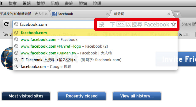 另外還有一個隱藏版功能,只要在網址列按一下tab鍵,就可以直接搜尋FB,人肉搜索更省時!