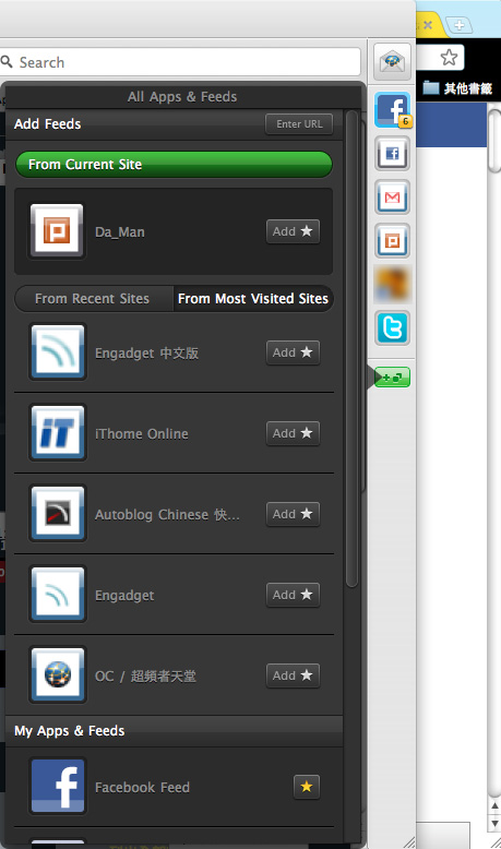 以上就是短暫使用RockMelt的體驗,目前網頁開啟的速度很快,不過可能是因為還沒有裝很多外掛,還要後續觀察。另外就是臉書的相關功能,因為大人物的網路不會擋臉書,所以沒辦法測試如果在臉書被擋的網路環境下,會不會受到影響,還是可以突圍成功,這個就請大家回報啦!