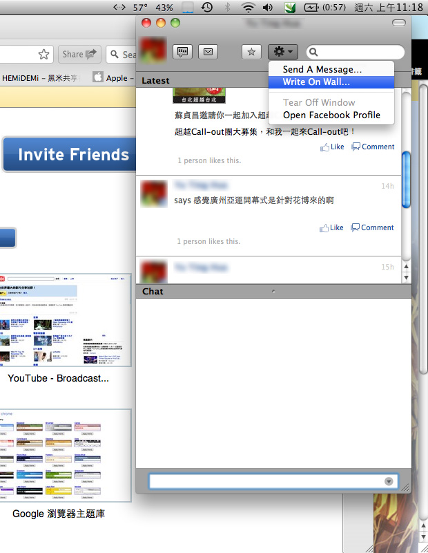 每個朋友的對話視窗可以拉出來變成單獨的視窗,還可以直接留言到他的塗鴉牆上、寫私人訊息到FB信件匣。
