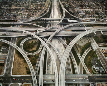 從空中俯瞰洛杉磯的Judge Harry Pregerson Interchange,還真被這麼錯綜複雜的路線弄得眼花撩亂,作為I-105公路及I-110公路出入口的Judge Harry Pregerson Interchange,共有4層樓高,並限制只有高承載車輛才能進入,以緩和已經快要打結的交通流量,不知道在上頭的駕駛者,搞得清楚該從哪個出口下橋、哪個入口上橋嗎?