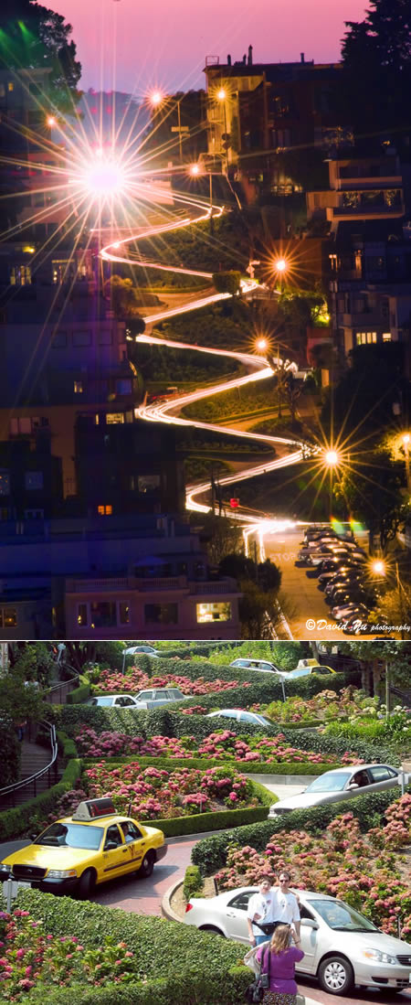 考過駕照的人都知道,台灣路試時的S行彎道,大概只能在舊金山的Lomard Street派上用場,特別是在Hyde Street及Leavenworth Street這段路,短短1英里的距離就有8個轉彎,而且還在27%的陡坡上,據說當時就是因為擔心坡度太陡,所以設了這麼多的「路障」,以免有車子失速衝下去,現在Lombard Street限速5 mph,而且設為單行道(以免兩方都有來車時,有一方會發生倒不了車的窘境?),不過咱們比較好奇的是,在Lombard Street兩旁的都是高級住宅,為什麼有錢人會想住在這邊虐待自己的車、自己的腳呢?