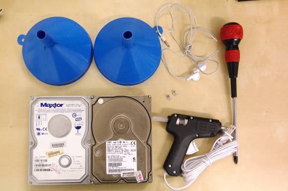 材料:五金行買的漏斗x2 (10元一個)、家裡壞軌的硬碟x2、耳機一副、螺絲x2