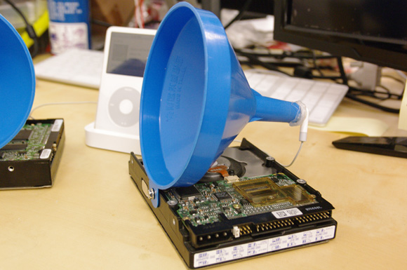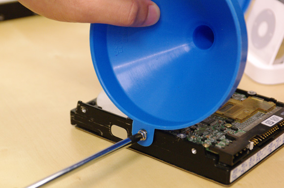 好,恭喜你!已經踏出成功的第一步了~再來就是把黏好耳機的漏斗固定在硬碟上,這裡要特別注意,記得要找頭比較大的螺絲,這樣漏斗才能固定在硬碟上。