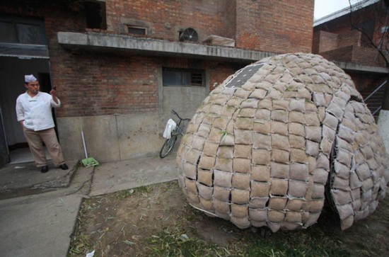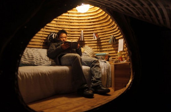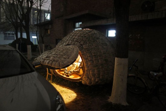 因為北京租金太高,租不起房子的他,只花了兩個月的時間和人民幣6,400元的預算(約台幣兩萬九千多),就用竹子編出「蛋殼」的雛型,然後用各種絕緣材質和裝滿鋸木屑和青草種子的麻布袋覆蓋在外頭,至於蛋殼內部,雖然只有一坪大小,該有的床鋪、洗手檯、電燈、書架還是一應俱全,而且電燈還是採用太陽能發電,搭配靠著他定期澆澆草或是老天爺賞水灌溉所長出來的嫩草,咱們還真只能說,這個蛋殼居還真是經濟實惠的綠建築啊!