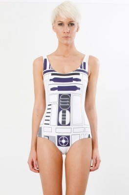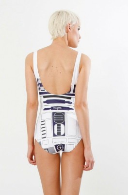 設計師James Lillis根據最經典的科幻電影「星際大戰」(Star Wars)裡的兩個人氣機器人角色R2D2和C-3PO的形象,設計了兩款相當有科幻風味的泳裝,透過模特兒的展示,我們可以看到星際大戰粉絲,未來又多了新的服裝可供選擇了(誤)