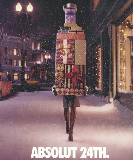 最喜歡ABSOLUT能把各式各樣的物品搞成標準伏特加瓶身圖樣,而且我們很高興留著白鬍子的老人退休去了,現在改由短裙辣妹來送禮!