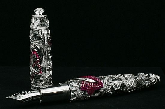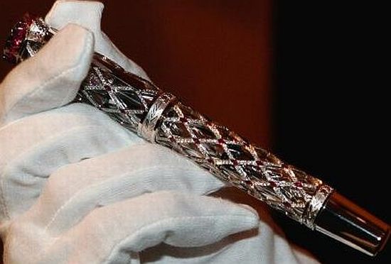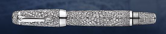萬寶龍所推出的Boheme Royal鋼筆,筆尖是鍍了白銀的18K黃金,筆杆是鑲了1,430顆鑽石的18K白金,光是萬寶龍的標誌,就耗費了19顆鑽石,在同樣閃耀刺眼的18K白金襯托之下,絲毫沒被搶去一點光彩,每支要價美金一百五十萬元,果然有鑽沒鑽價差很大啊!