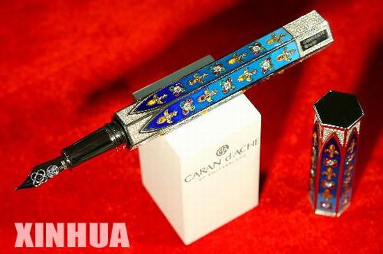 Caran d’Ache最近在中國推出的哥德系列鋼筆,看了就知道是為了慶祝哥德式建築所發行的紀念鋼筆,特殊的六角形造型筆身上,有著著名的哥德式窗戶、鳶尾花紋及薔薇花飾,並鑲嵌上總計7.1克拉的892顆鑽石,而薔薇花飾更以72顆綠寶石及72顆紅寶石裝飾,要價人民幣三百二十八萬元。