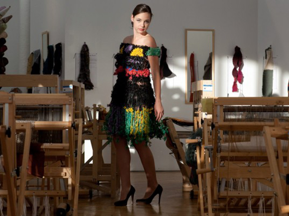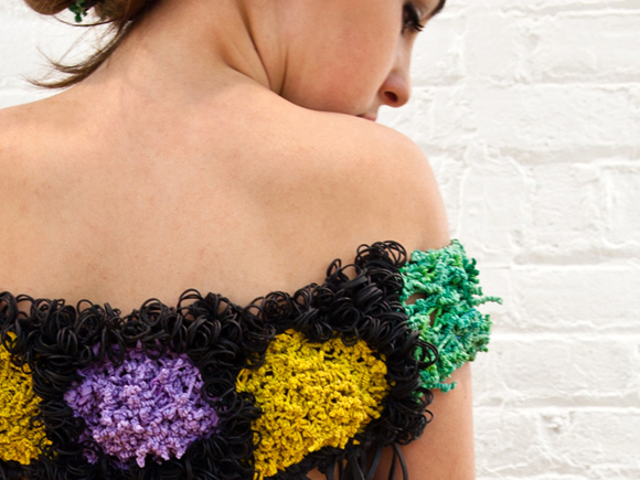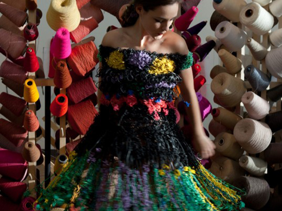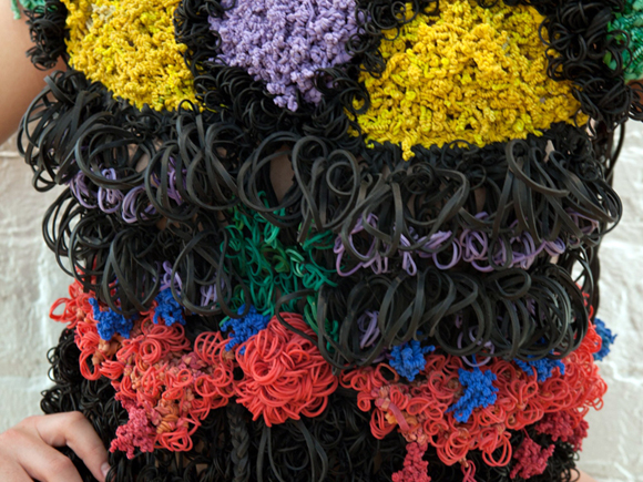 這件色彩繽紛的小洋裝「RB Dress」,就是紐約建築師Margarita Mileva(還不是服裝設計師?!)為了參加在柏林舉行的the Wear is Art競賽,用了14,235條橡皮筋純手工編織而成,穿在身上大約四公斤的重量,頗具份量,而且除非麻豆是20吋纖纖細腰,不然腰身部分看起來得靠攝影師取角取巧,才不會有太臃腫的感覺。