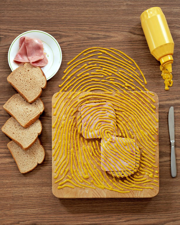 這位叫做Kevin Van Aelst的紐約藝術家,將生活中各種物品都當成他的創作素材,舉凡錄音帶、芥末醬、糖粉、毛線、餅乾等等,將它們細心排列成指紋圖案,形成一幅超耐人玩味的作品喔!