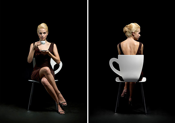 你能想像如果慾望城市的幾位慾女們,好不容易找到一間符合時尚標準的咖啡店,準備開始喝咖啡、聊性心事的時候,發現身上的名牌包沒地方放只能攬在身上,這種狀況真是讓人吹鬍子乾瞪眼啊(是哪裡來的鬍子)。這個長了耳朵的掛耳式咖啡杯造型椅就很聰明,把椅背作成咖啡杯的造型之後,把手還能順便掛包包有夠優雅。