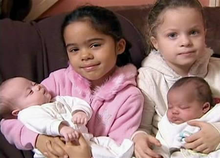大家都知道異卵雙胞胎外表上本來就不太一樣,然而如果是白人媽媽和黑人爸爸生下的異卵雙胞胎,差異會有多大呢?英國就有對黑白配的跨族夫妻Alison Spooner和Dean Durrant ,生下了兩對同樣是黑白配的雙胞胎,一連生下兩對異卵雙胞胎的機率本來就不大,現在再加上膚色一黑一白、一白一黑,嗯......只能說上帝是想跟大家證明,黑色加白色不一定會變成灰色吧!