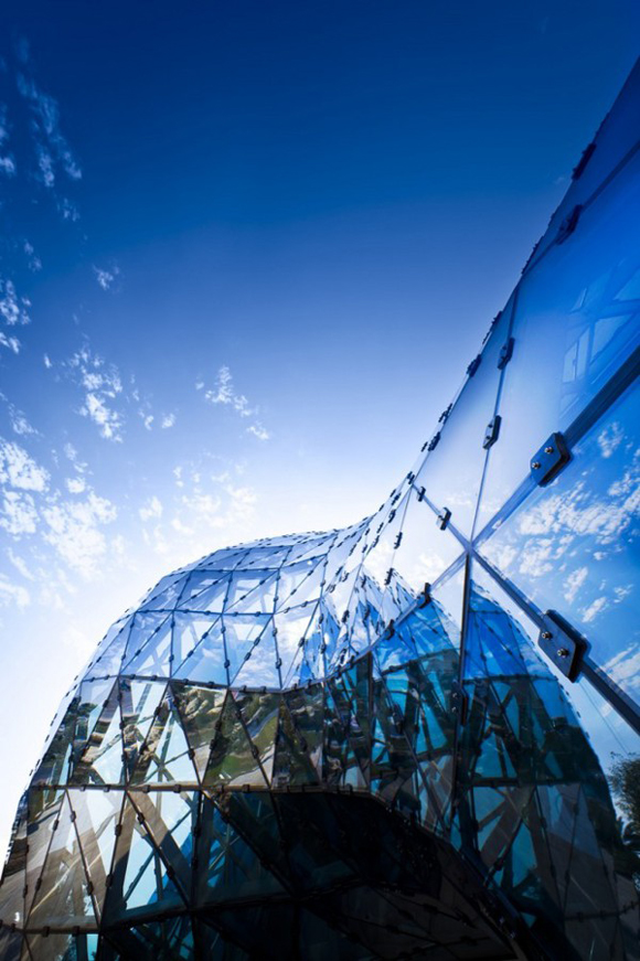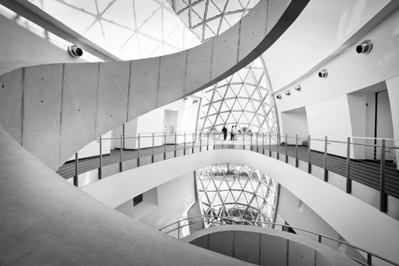 然而來到這裡,首先讓人驚艷的或許不是館內的收藏,而是這棟看起來有點像被水珠穿透的建築物,玻璃帷幕反射著蔚藍的天空,顯得館內灰、白色的色調,螺旋狀的階梯以及圓弧狀的對稱空間,就像是不屬於這個世界的超現實空間。