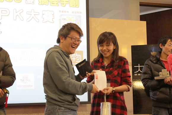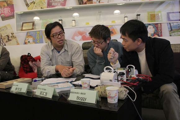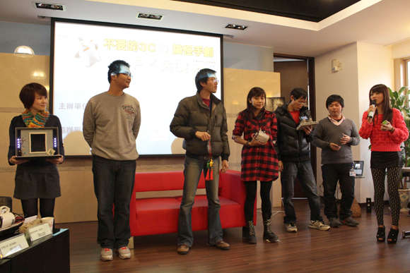 現在還請來了三位專業的評審,包括了騰雲廣告公司總經理Boggy、時報出版資深編輯郭正皓跟癮科技編輯奕之華(就是傳說中的「鍵神」啊!拜~),瞧他們熱烈討論參賽作品的模樣,果然真是認真的男人最.....3C啊!