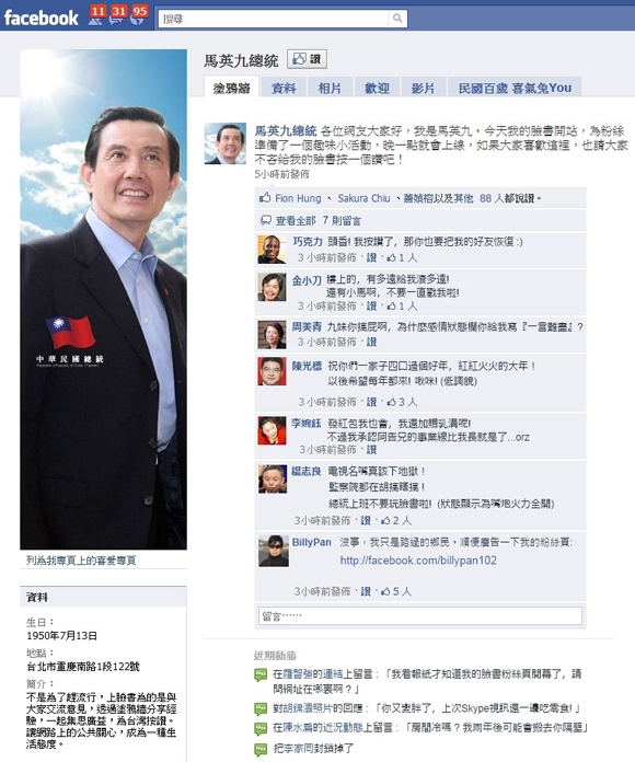 在這個沒臉書會沒 選票 朋友的年代,政治人物有個官網、噗浪、推特跟臉書都是很正常的事,在這光輝的一百年我們的馬英九總統,也效訪米國歐巴馬元首的精神,選在今天開創了「馬英九總統」的臉書帳號喔!有興趣的朋友記得去按個讚喔!(話說,「總統」兩字應該不算真名吧,到底....會不會繼「伍佰」之後被臉書官方刪帳號?XD)
