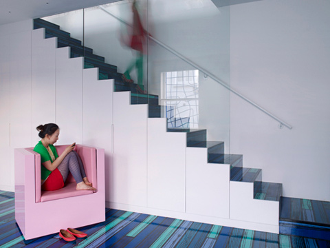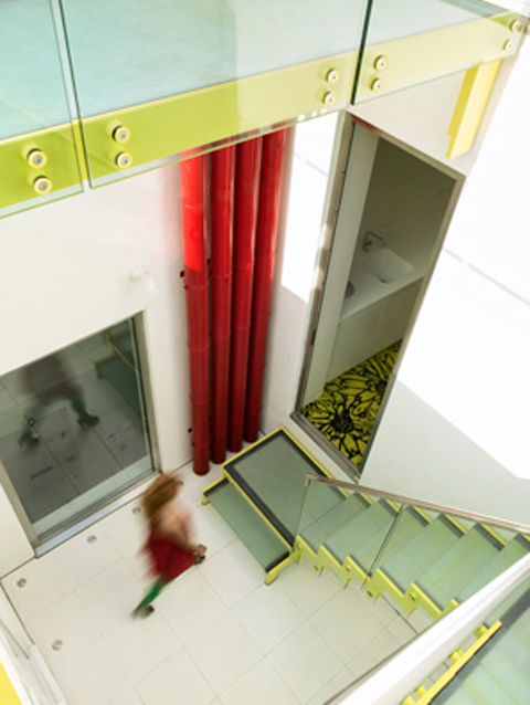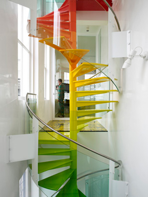 除了以上令人驚奇設計之外,房屋中間的螺旋狀彩虹階梯,使用玻璃鋼和鋼材製造,直達房屋最上方,並且在每個樓層,它的色調差影響了該樓層的色彩,製造出一種視覺的節奏,在最高層的樓層陽光透過天窗傾瀉下來,將這間彩虹屋充滿陽光與色彩。