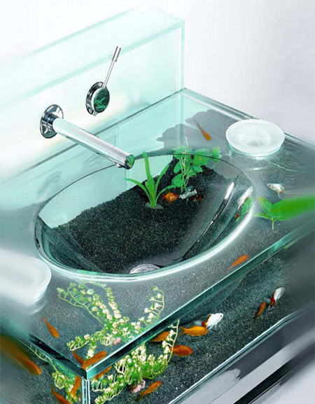 全透明的外觀,裡面的魚和水草可是貨真價實。上蓋可以搬開來以便清洗魚缸和種植水草。裡面還有建構水循環系統,當然不是利用洗手洗衣服的水去做循環。一組4,500美元,不便宜的魚缸跟洗手檯啊…