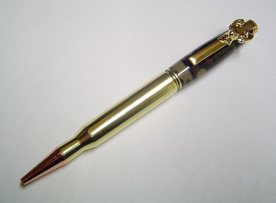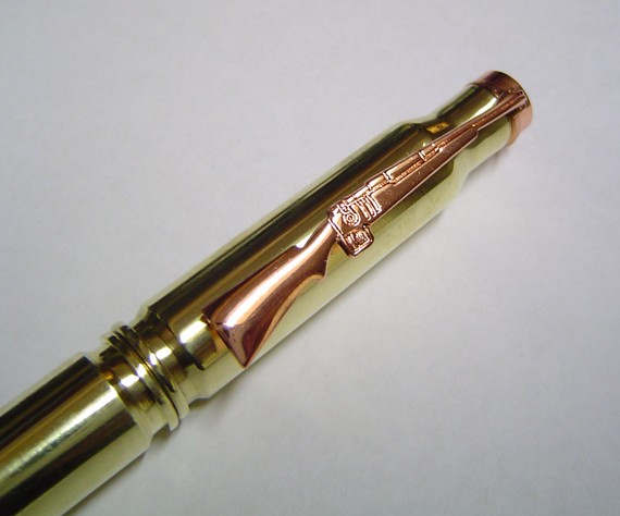 每一發精緻的子彈筆是來自Dorian Creations的手筆,整個系列都使用擊發過的彈殼製作,由於筆桿要有一定的長度比較好握,所以使用步槍、來福槍等大型槍枝的.308口徑子彈。因為用了真正上膛過的子彈,就算已經經過拋光處理,你還是能看到一些刮痕,其他使用的材質則有純銅和壓克力等等。從筆桿上還能看到夾子同樣設計成槍枝的造型, 很值得品味的小細節啊!