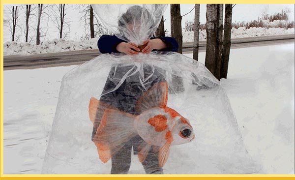 在湖邊釣魚的草帽男孩,後方的女生極力在後方拉住。別懷疑,全身上下都是透明膠帶組成,從透明的身體就能夠察覺。而且小女孩的髮絲做的還真細心,連動態的感覺也做出來了呢!