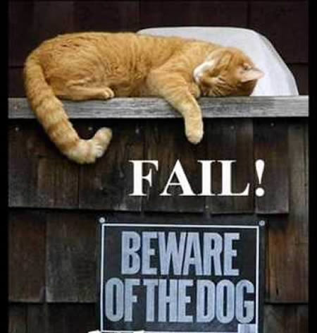 貓狗之間的情仇還真是一言兩語無法說完,瞧瞧這隻大剌剌在「內有惡犬」標示上睡覺的阿貓就知道了啊!