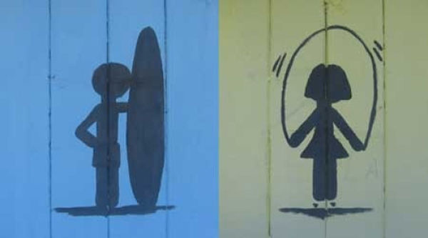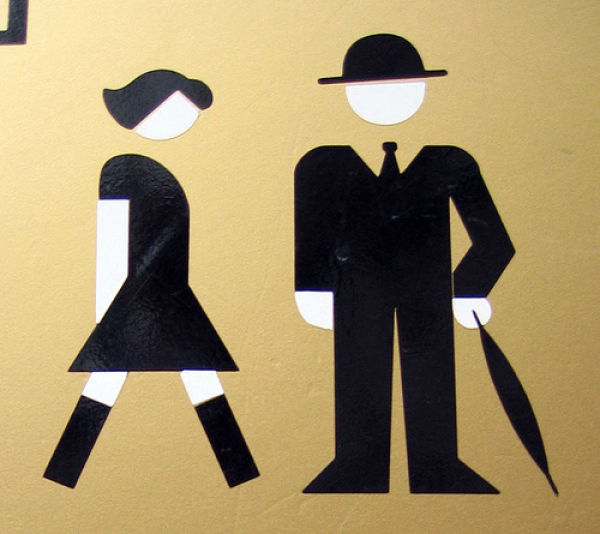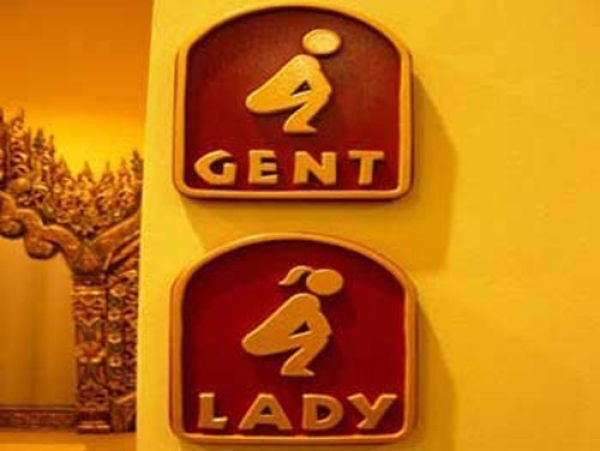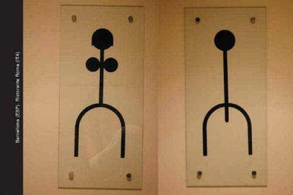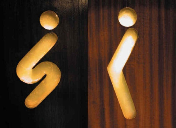 基本上大部分的地方,男性都是設計成藍色,女性設計成紅色,不然就是用特徵來分辨,像是男性用的物品如紳士帽、煙斗或是小YG乃口(?)就可以拿來代表男廁,而比較女性意象的東西,如口紅、高跟鞋或是丁字褲(?)等,看到就知道是女士優先的地方。