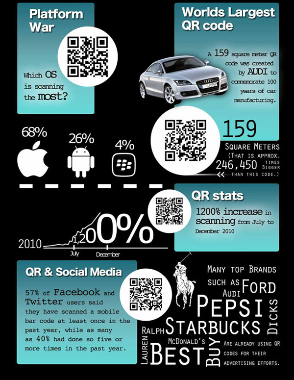 許多知名品牌如AUDI、FORD、PEPSI、Ralph Lauren、Starbucks、Dicks、BEST BUY、麥當勞等,已經開始使用QR Code增進他們的廣告效果。