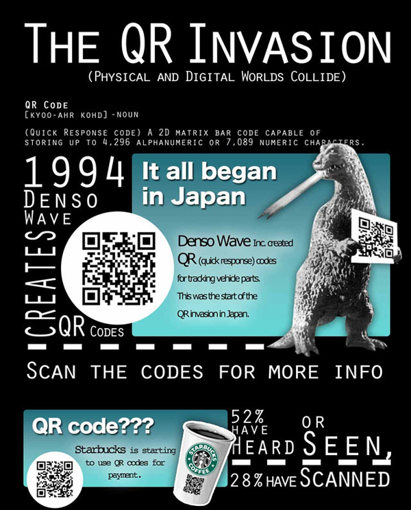 QR Code從日本開始發跡,1994年由日本Denso-Wave公司發明,發明者希望QR Code可讓其內容快速被解碼,剛開始是用來追蹤汽車零件之用,目前QR Code最常見於日本,並為日本最流行的二維空間條碼。