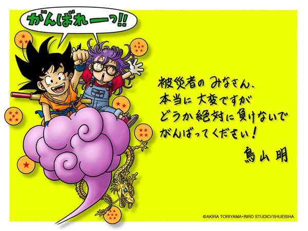 這幾天日本東北震災慘重,急需全世界關注與幫忙,而在日本動漫界也有不少資深漫畫大師紛紛也自己的畫作,幫日本的當地災民加油打氣,像是在賑災第一時間就在自己twitter上面用iPad,創作了數十幅笑臉照的灌籃高手作者井上雄彥,就用一張張的笑臉溫暖了許多人的心,而以「七龍珠」家愈戶曉的漫畫大師鳥山明也宣布與日本週刊少年JUMP合作,在JUMP官網上發表幫大家加油的插畫,而廣告收益將全數作為賑災之用!