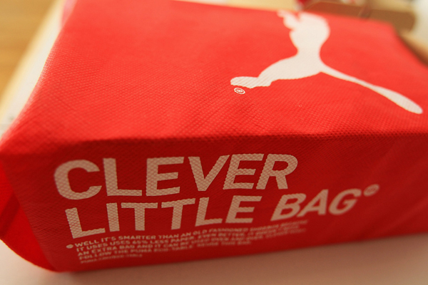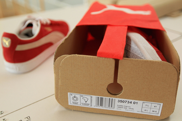 在2010年PUMA經過完整的供應鏈測試及驗證環境評估效益之後,推出這一款聰明環保鞋袋,這個新的包裝系統使用100%再生紙製成的內部硬紙板盒,外布鞋袋以高達10%再生物質製造的100%PU製成的不織布包,每年將節省超過65%的紙張與60%的水、能源與燃料消耗量。