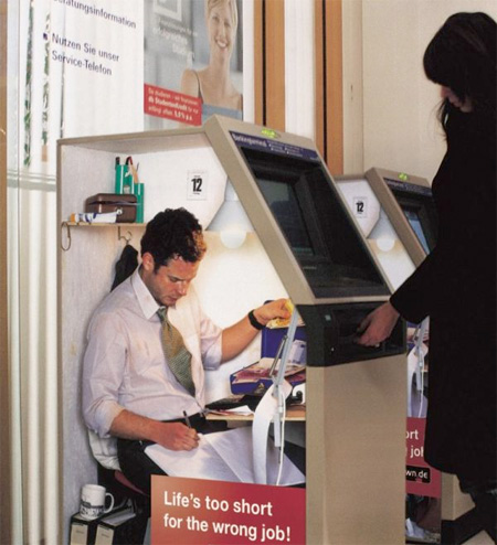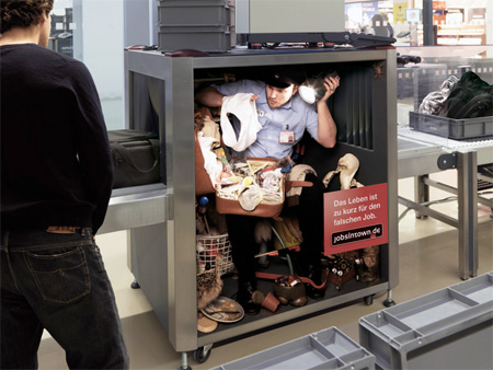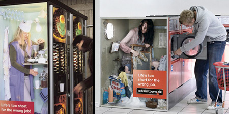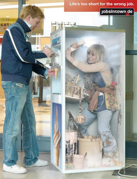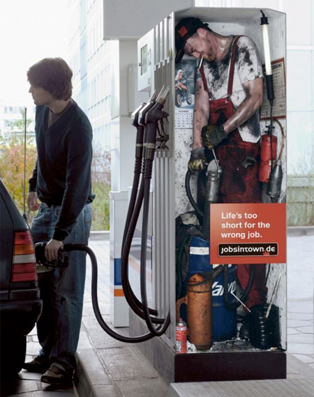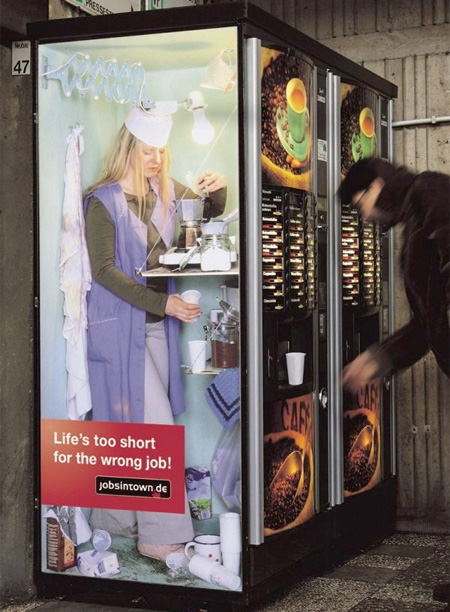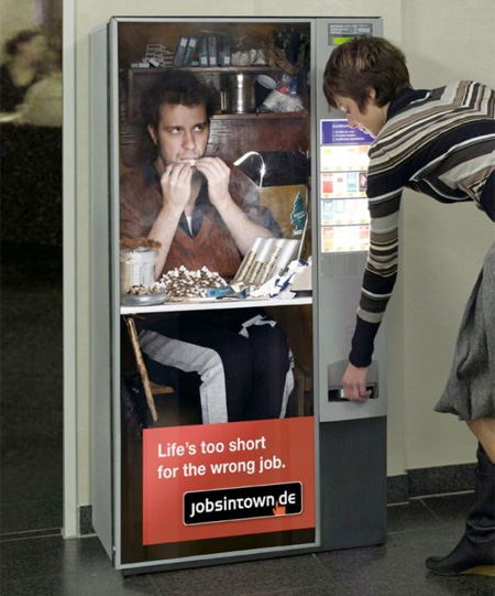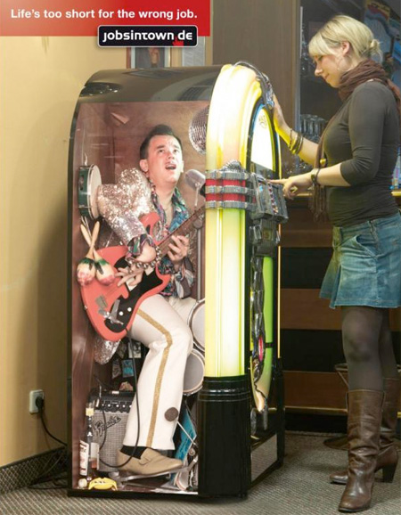 這系列廣告由德國人力銀行公司 Jobsintown.de 所推出的品牌形象廣告,因為「Life's too short for the wrong job」(生命不該浪費在錯誤的工作上)這一鮮明又讓人印象深刻的文案而聞名,比起台灣最近媒體上常看到的 我家工作機會比你家多 的人力銀行廣告,真是顯得有趣多了。