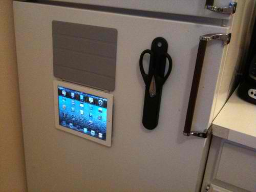 利用保護蓋本身的磁性,將整組 iPad2 都吸在冰箱門上,平常可以當留言版用,看完留言後就可以順手打開 Angry Birds 再它破個幾關;或者煮完一頓香噴噴的宵夜、想和其他夜貓朋友分享自己 欠揍 的喜悅,也可以立馬抓起 iPad2 拍下來上傳 (第一代 iPad 可是無法拍照的喲),活脫脫就是一個智慧型廚房的雛型,所謂名字取得好要飯要到老,這個 Smart Cover 可真的是很聰明阿!