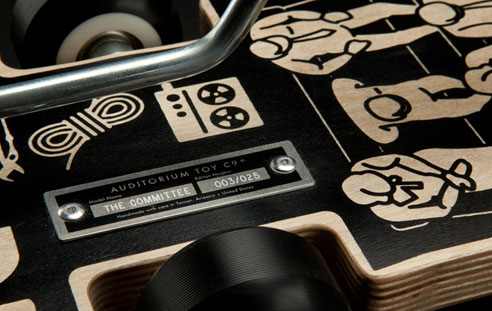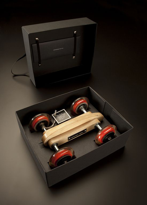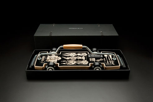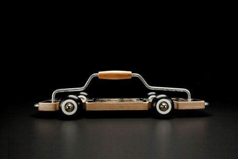 由設計師Brad Denboer所主腦的網站auditoriumtoyco發表了一台看起來很像滑板的玩具車(或是很像車的滑板),在車身上可以看到這是台可以容納六位同學的休旅車(疑?),而車身後還有手工繪製的零組件,搭配精緻的包裝,最重要的是,這台「滑板車」可是純手工的,在「車」身上還有專屬編號,更添收藏價值(根據網站所說,這是你可以當作傳家寶的經典玩具)。