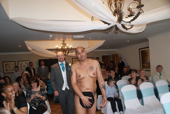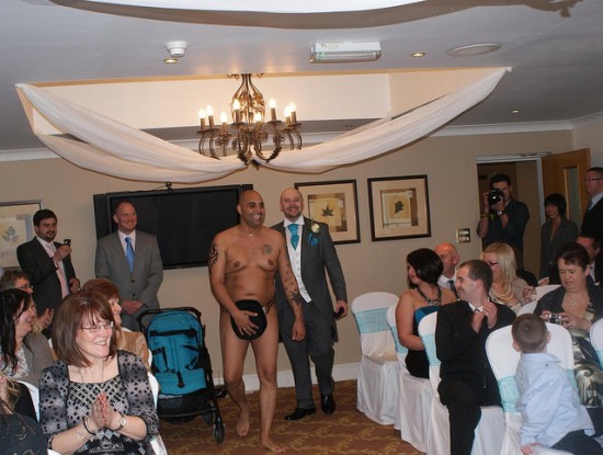 婚禮當天,他們只用簡單的帽子、捧花以及幾乎遮不了什麼的內褲,蓋住重點部位,在音樂聲中緩緩入場,儘管禮服略顯「寒酸」,到場的賓客仍舊獻上最誠摯的祝福。