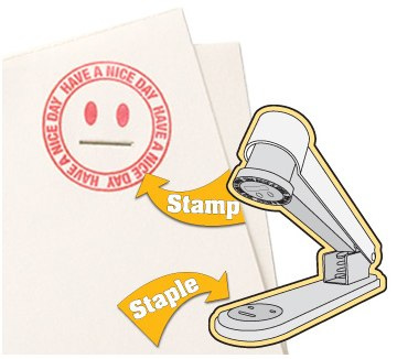 這一個圖章釘書機會在任何使用釘書針地方加上一個笑臉,圖章就是臉部而釘書針的地方就剛 好變成嘴巴。周圍再加上了『祝有個美好的一天』,真是十分貼心的祝賀語啊。在繁忙的工作環境或是報告交稿時,利用這樣一個微笑釘書機呈給上司或教授。也許 無意間就能減少退稿的機率,有些教授甚至會給高分吧~