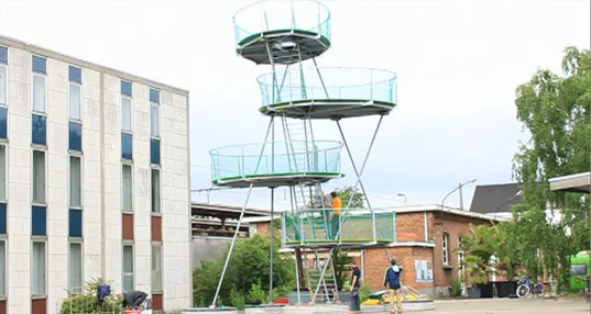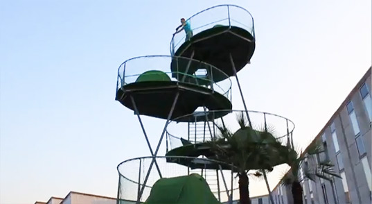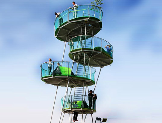 通常一般人提到露營,大多是遠離市區,到某個景色優美的地方,住上一、兩晚,會選擇留在城市裡露營的,要嘛是學校出的整人作業,邀請爸媽陪小孩到學校操場體驗親子露營,要嘛是訂不到青年旅館又預算不足的背包客,有鑒於此,Import Export Architecture乾脆設計出可以拆卸、組裝、移動的五層樓帳棚組,讓大家即便身在都市叢林中,一樣有辦法一邊遠眺夜景、山景、高樓景,一邊享受露營fu。