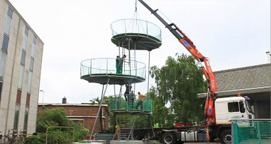 照片中每層平台上頭架起帳棚後,看起來還夠大家伸個懶腰、活動筋骨,或是上下打個招呼、聊個天,非常適合露營客彼此交換心得、聯絡感情,而且外頭還圍上一圈網子,安全上也多份保障,至少半夜夢遊,不容易掉下去就是了,比較可惜的是,組裝時似乎要出動吊車,才有辦法架到五層樓這麼高,在組裝上面好像沒有想像中簡單。