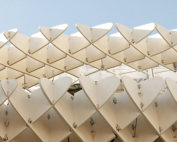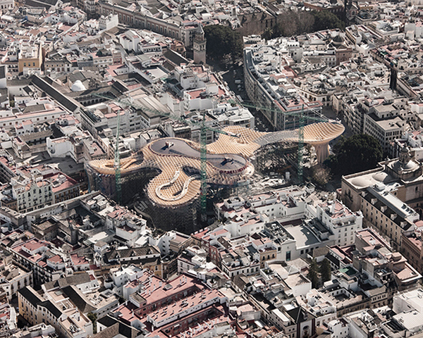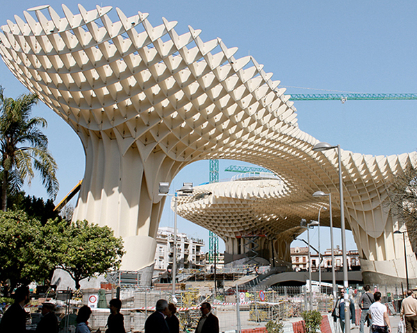 Metropol Parasol是由J. Mayer H. Architects設計、建造,木造式的蜂巢式結構,彼此相互環扣著,編織出成片的雲朵,也有點像把超級大陽傘,這座現代化建築物的出現,不僅稍微中和了塞維亞的中世紀韻味,也成為塞維亞的新地標,而「傘」下的樓梯和店面,更將Metropol Parasol拱成世界上最大的木造建築物。