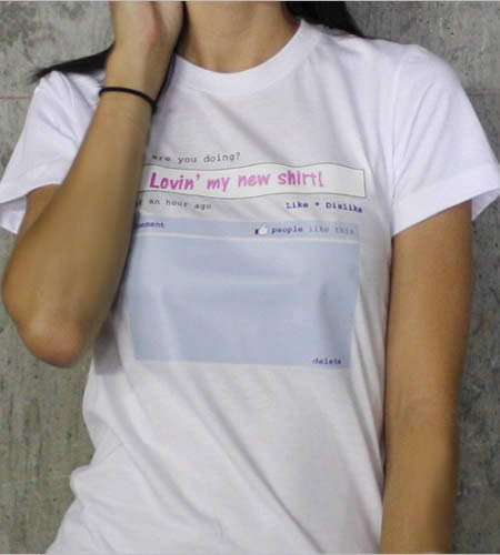 常常忙到沒時間上臉書更新自己的最新狀態嗎?沒關係,臉書狀態T-shirt特別設計了「更新區」,材質不祥,不過據說可以用可水洗式彩色筆在上頭隨時修改狀態,雖然低頭在自己胸部前寫字的姿勢,看起來有點詭異,建議大家最好先學會如何上下顛倒寫字,不然還是穿之前就更新比較好喔!