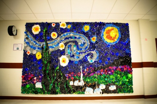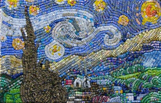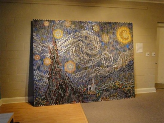 美國維吉尼亞大學(University of Virginia)的兩位學生Ross Thomas和Elizabeth Farrell,收集了八千個瓶蓋,拼成了梵谷名作Starry Night,這幅7呎x9呎的「巨」作,最驚人的地方當然不是他們居然有辦法弄來八千個瓶蓋,而是他們依照瓶蓋的顏色加以組合、分配,拼出這幅世界名作。
