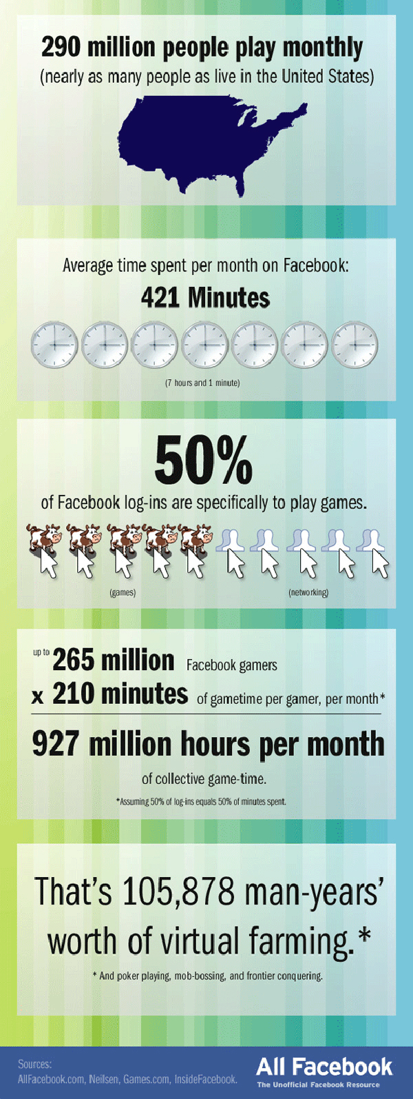 9. 兩億六千五百萬人(臉書遊戲玩家) x 兩百一十分鐘(一個玩家一個月平均花費在遊戲上的時間)= 九億兩千七百萬小時(所有的遊戲時間)