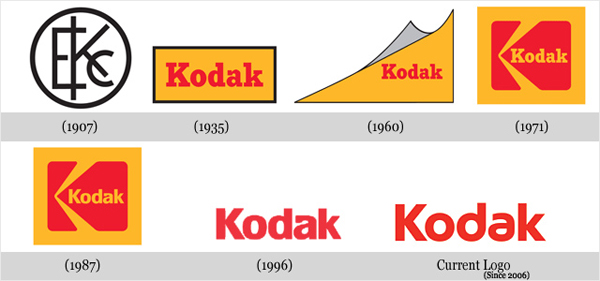 有趣的是,柯達1907年的logo是當年第一個將名字寫得像圖畫的公司。到了1935年,柯達使用了黃色與紅色作為主體,並沿用至今。1960年,柯達設計了一個像翻頁紙張一般的logo,不過到1971年,被一個在黃色外框和紅色內在之間藏著英文字母“K”字樣的logo給取代。這似乎是個在當時很新穎的設計,可惜似乎太過複雜。結著,就像其他廠商一樣,柯達將logo簡化為今天討喜的模樣,可惜柯達還是無法免於沒落的命運。