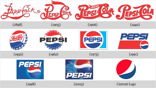 在1890年代,Caleb Bradham創立百事時,名稱為Brad’s drink,後來迅速改成Pepsi-Cola(百事-可樂)。直到1903,這個名稱終於有了商標權,並用了好一陣子。接下來真正的大改變來自1940年代時, Walter Mack(當時百事的CEO)的主意。Walter Mack讓百事有了新的瓶子,以及以瓶蓋為主體的新logo。當時正好處於第二次世界大戰,因此為了支援美國,使用了紅、白、藍這三個顏色(台灣表示:賺到了)。