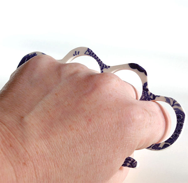 這只由藝術家Juliet Ames所設計的「青花瓷手指虎」,是用回收破掉的瓷器碎片所製成的,原本逞兇鬥狠的手指虎,搖身一變變成了藝術品,除了看起來很兇狠,還多了些些文藝氣息,萬一真的幹起架來了,還可以邊唱首周董的「千里之外」,讓人家一路好走啊XD!(誤)